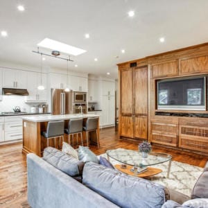 Style, quality, space and location make this home an exceptional stand-out. Features include an open concept kitchen and family room; top-of-the-line appliances including a Dacor wall oven and gas stove top; energy-producing solar panels; master with ensuite and walk-in closet; living room with wood-burning fireplace; formal dining room; gracious principal rooms; hardwood floors, built-ins and skylights on all 3 levels; a finished basement with workout room with rubber floor; parking; and a large, fully-fenced private backyard.