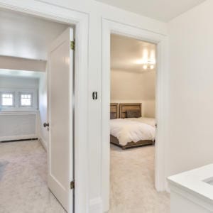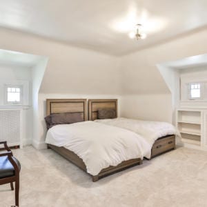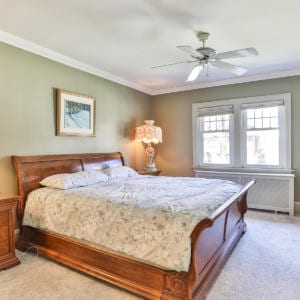 The second floor family room is flooded with light by four large windows. Wood burning fireplace surrounded by built-in bookshelves and lower cabinetry. Master bedroom has extensive closet space with 6 closets featuring built-in shoe rack, organizers and drawers. Ensuite bath is divided into a 2 piece, and a 3 piece with stand-up shower, soaker tub and mirrored sky light. Second floor also has two more large bedrooms with closets and a 3 piece bathroom. Two more bedrooms on the third floor as well as a storage enclave and 4 piece bathroom.