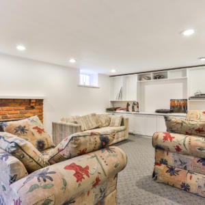 The lower level recreation room has a brick-face fireplace and built-in bookshelves. Laundry room is a generous size with large sink, fridge, and storage.