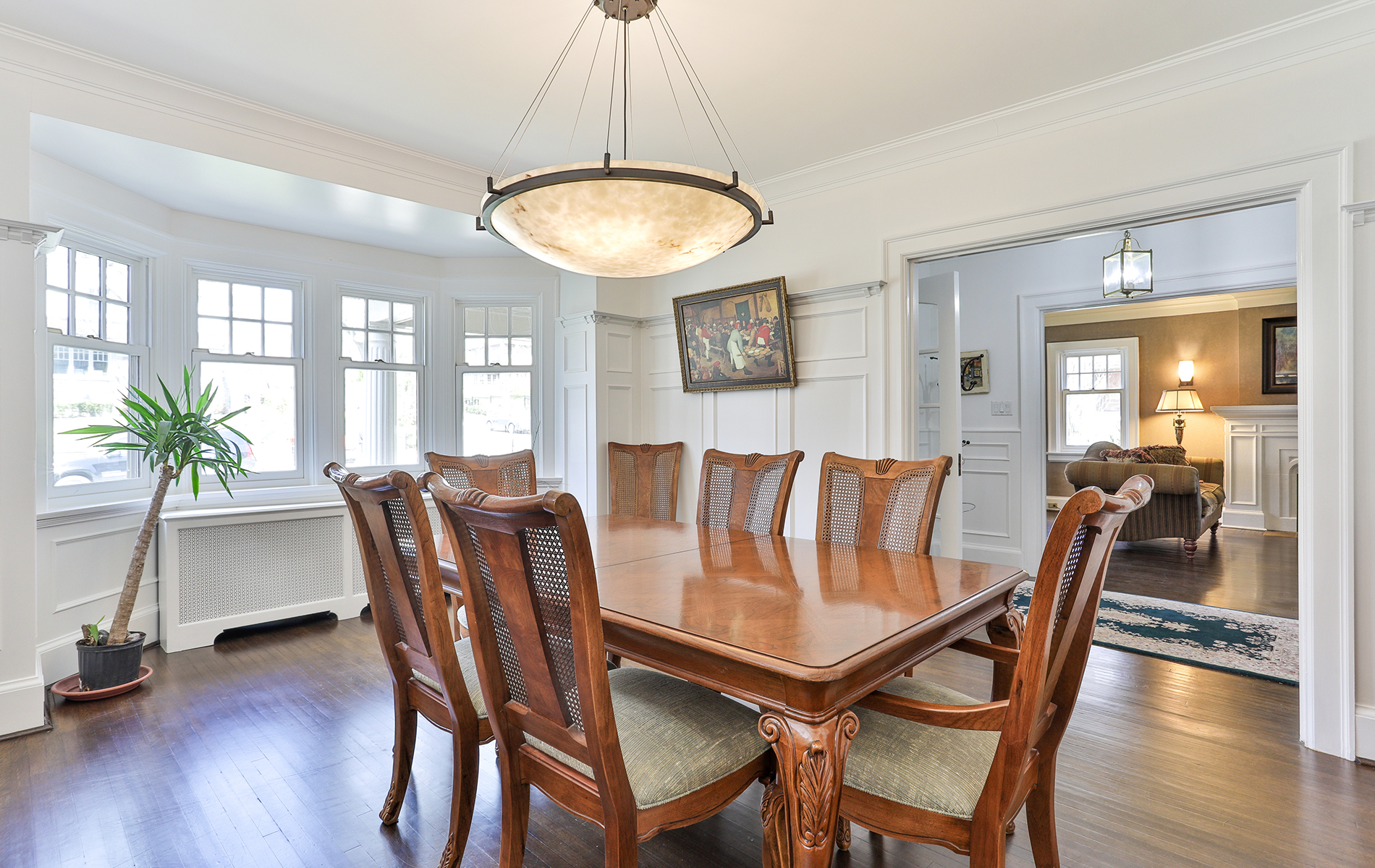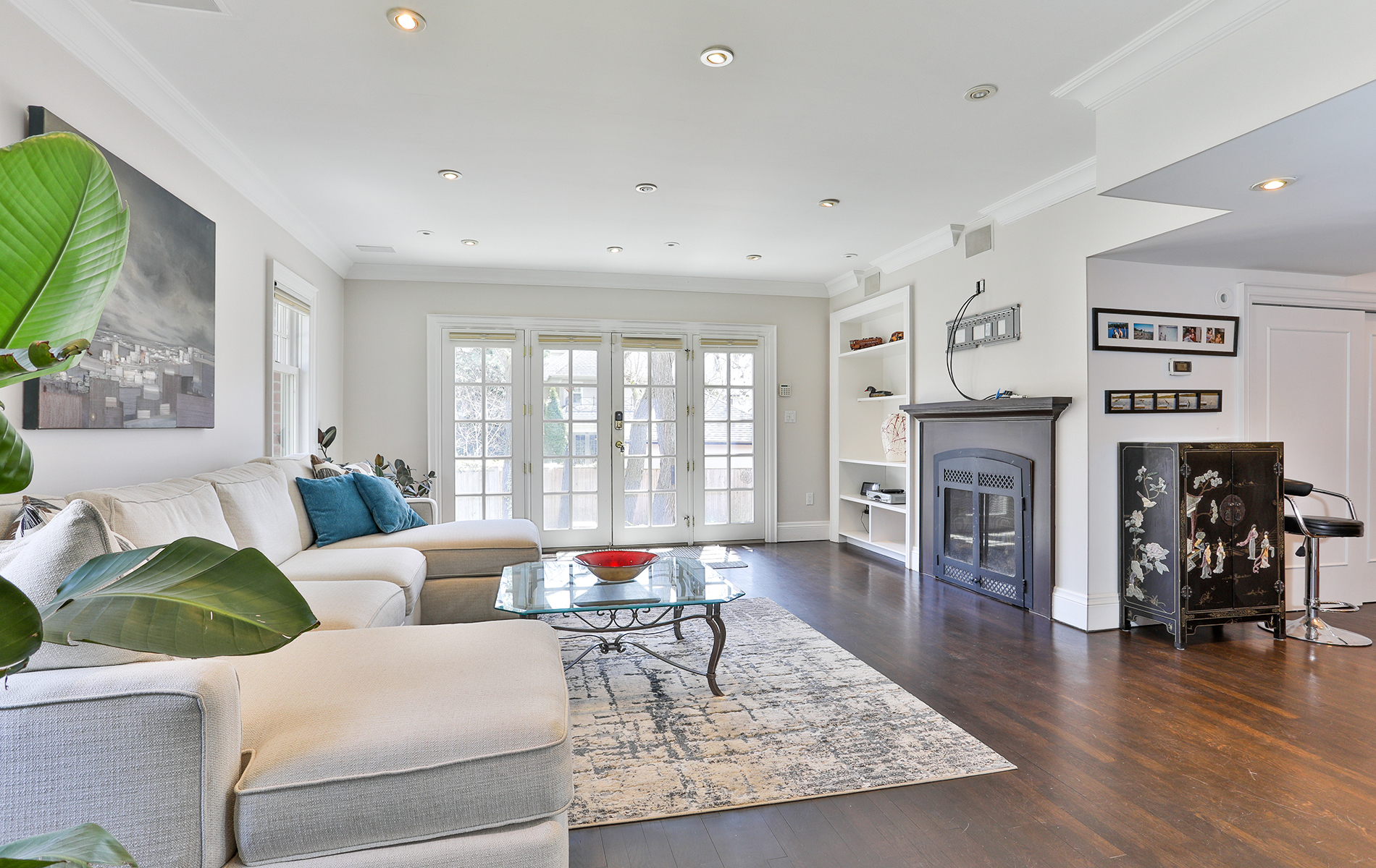 129 Garfield Avenue, Toronto – Situated on a corner lot on one of Moore Park’s most prestigious streets. Entry with solid wood exterior door and beveled glass interior door. Well thought out Centre Hall floor plan makes for a perfect family home with 5 bedrooms and 6 baths. Elegant gas fireplace and large bay window area in the beautiful living room. French doors lead you to the family room addition with pot lights, large windows, wood burning fireplace, built-in bookshelves, and South facing wall of full length windowed hinged doorway to the private terrace. The family room opens to the kitchen with high-end stainless-steel appliances including stacked oven, microwave, and warming drawer. Ample storage and pantry, large island with gas cooktop and bar stool seating. Traditional, spacious dining room with magnificent hanging light fixture, bay windows, and panelled walls.