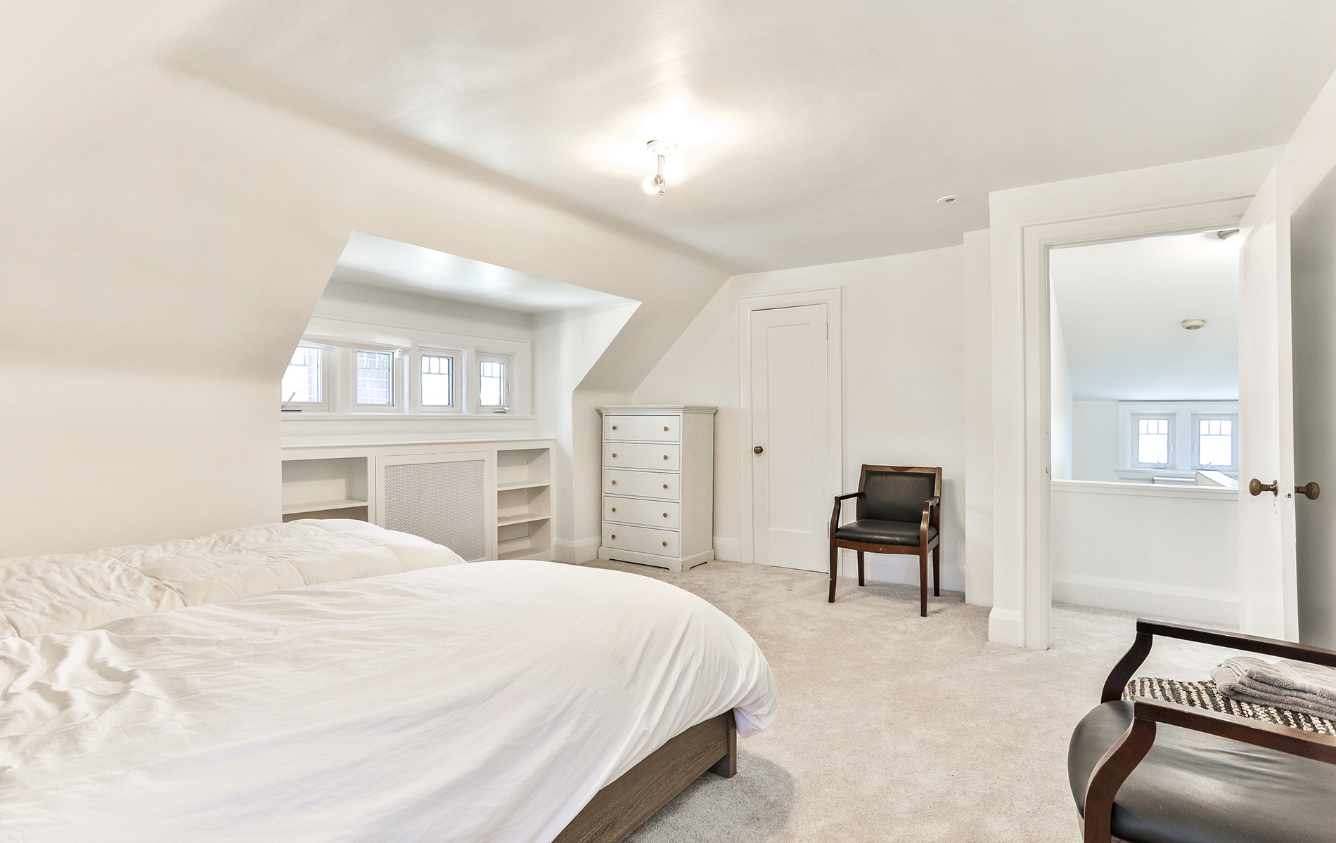 The second floor family room is flooded with light by four large windows. Wood burning fireplace surrounded by built-in bookshelves and lower cabinetry. Master bedroom has extensive closet space with 6 closets featuring built-in shoe rack, organizers and drawers. Ensuite bath is divided into a 2 piece, and a 3 piece with stand-up shower, soaker tub and mirrored sky light. Second floor also has two more large bedrooms with closets and a 3 piece bathroom. Two more bedrooms on the third floor as well as a storage enclave and 4 piece bathroom.