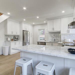 136 Donlands Ave – Fantastic opportunity to live in this beautifully renovated home! Open concept and spacious main floor with tons of natural light and white oak hardwood. Kitchen features KitchenAid appliances, Carrara marble, tons of storage, and breakfast bar. Upstairs are 2 bedrooms and a 4-piece bath. Lower level with large laundry room with built-in storage, 4-piece bath, recreation room. Private, fenced backyard, and garage with 1 parking spot. Steps to Donlands TTC, and Danforth shops, restaurants, parks, and schools. Use of 1 parking space within garage.