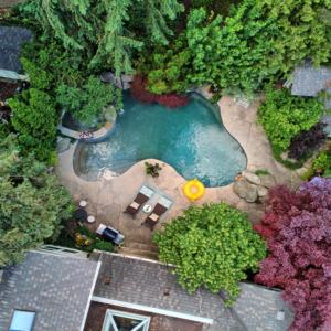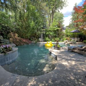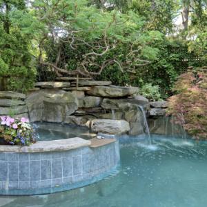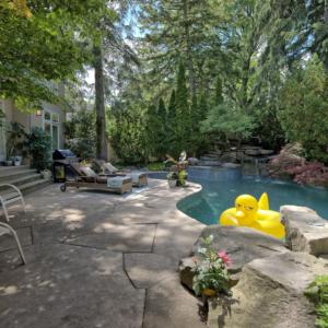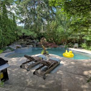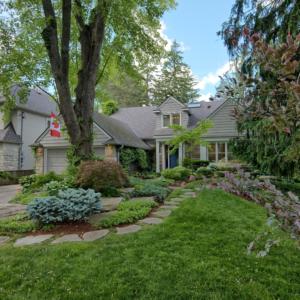 16 Romney Road – Gracious 4+2 bedroom, 5 bath home on a huge 75 x 130 foot lot on one of the most coveted streets in Edenbridge! Private, landscaped gardens with resort-like inground pool, spa, and cabana. Plenty of space to relax, stretch out and enjoy the waterfall, or entertain a large group on the stone patio. Inside, the elegant foyer opens to a grand living room with gas fireplace and large picture window. Formal dining room is open to the living, kitchen and family rooms – making the main floor great for entertaining. The family room boasts soaring cathedral ceilings, custom built-ins with fireplace and a wall of windows that overlook the garden and pool. The recently renovated open concept cameo kitchen features granite counters, high-end stainless steel appliances, and breakfast nook with walk-out to the back yard. Rare main floor primary bedroom features beautiful marble ensuite bathroom, walk-in closet, and stunning views of the lush gardens. It also has a unique 2nd floor office/den area! Updated main-floor laundry and mud room with side entrance and door to the one and a half car attached garage.