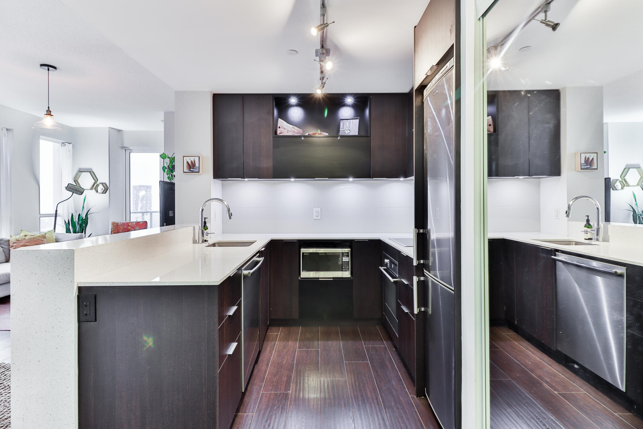 170 Sumach Street, Unit 1902 – This is the one! Style & function come together in this bright, spacious & modern 2 bedroom and 2 bathroom corner unit in hip One Park Place North! Open concept layout with high ceilings; fabulous and sunny southeast exposure; loads of windows; and an open balcony with an AMAZING city view (check out the CN Tower and Lake). Quartz counters, stainless steel appliances, clean-lined cabinetry and a breakfast bar create a chic kitchen. The thoughtfully constructed master bedroom has a double-wide closet, 4 piece washroom and tall windows while the 2nd bedroom has a large closet, 4-piece ensuite and a south view. Other features include: ensuite laundry; a well-designed entryway; a large locker and a perfectly located parking space across from the elevators.