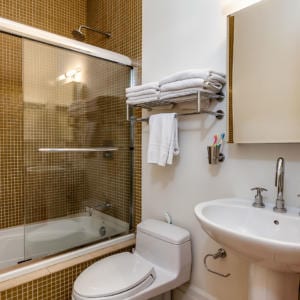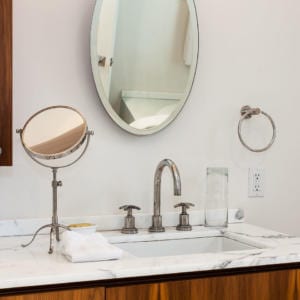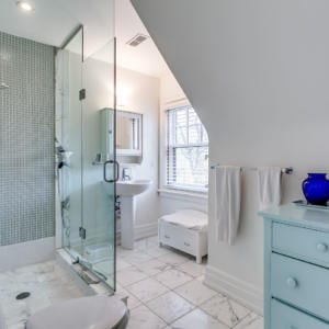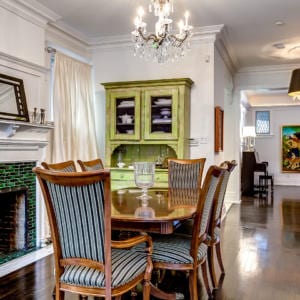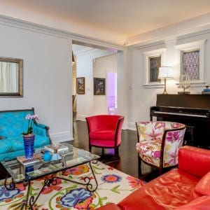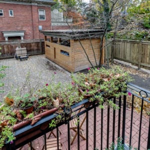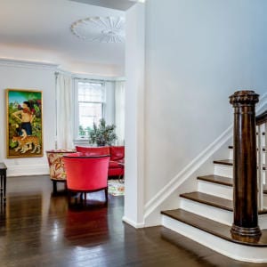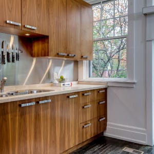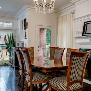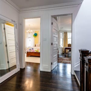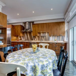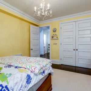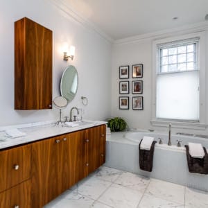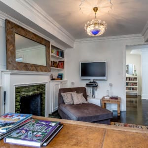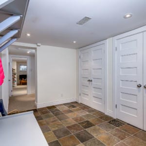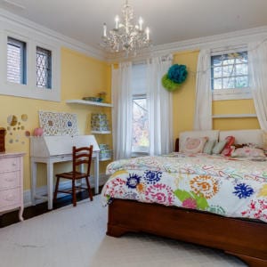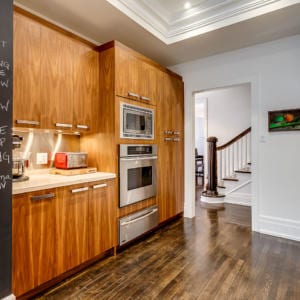 On the main floor, the oversized foyer is perfect for greeting guests and getting kids ready for school. The spacious formal living room boasts a wood-burning fireplace, bay window and stained glass. The fully-equipped chef’s kitchen has custom walnut cabinets, Thermador appliances, stainless steel backsplash and Caesarstone counters with plenty of prep room. The open concept layout between the kitchen, dining room and family room is great for both entertaining and for today’s family living. A wall of south-facing glass doors across the back of the home lets in plenty of sunshine and overlooks the city garden. There is also a main floor powder room with wainscoting, limestone floors and pedestal sink.