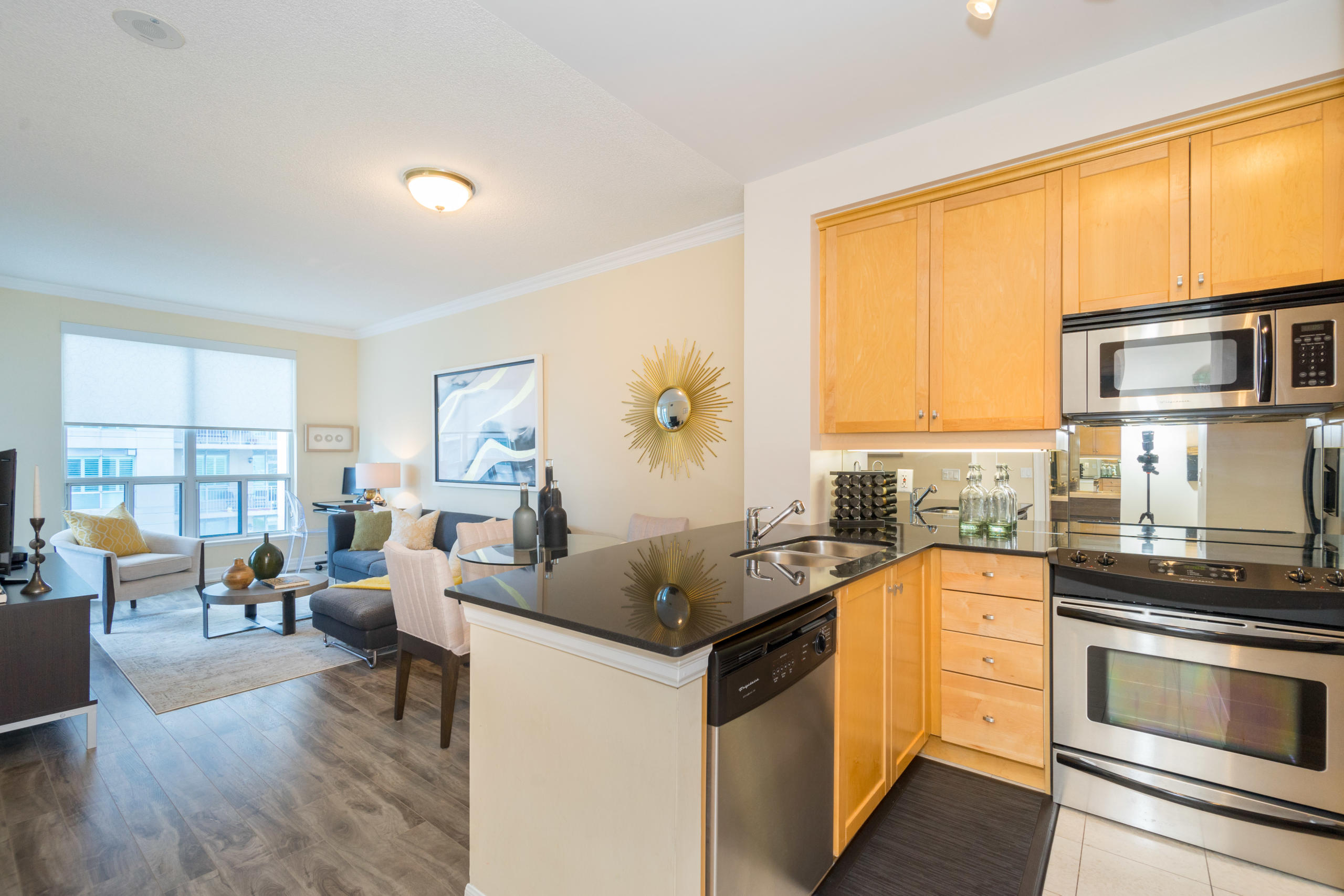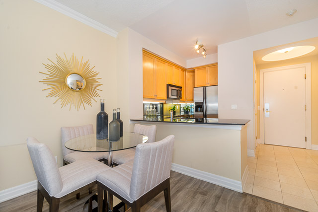 2087 Lakeshore Blvd W, Unit 1606 – Stunning 1 bed, 1 bath unit in the prestigious Waterford on the Lakefront. Bright and spacious with 9 foot ceilings and premium South West Exposure. The updated kitchen with stainless steel appliances, granite counter and mirrored backsplash overlooks the large living and dining room area. Relax on the balcony to enjoy tranquil lake views or bbq for guests.