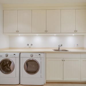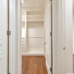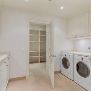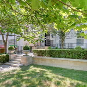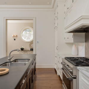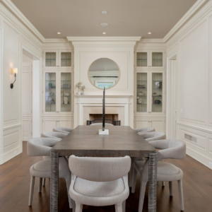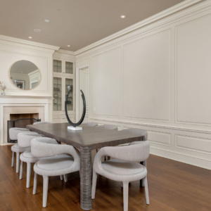 The designer chef’s kitchen comes fully equipped with a huge centre island with stone countertop, stainless steel gas stove and oven, built-in refrigerator and beautiful cabinetry. The adjacent servery has even more cabinetry for extra storage, plus a wine fridge and microwave. The spacious formal living and dining rooms each have a fireplace flanked by custom cabinets. The wall paneling dimensions allow for large scale artwork to be displayed. The living room opens onto a wonderful oversized stone patio with a south-facing rear yard that is professionally landscaped and fenced-in for privacy – ideal for lounging, family gatherings and entertaining.
