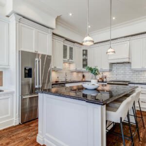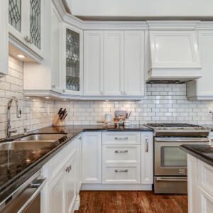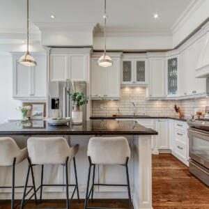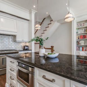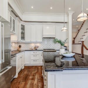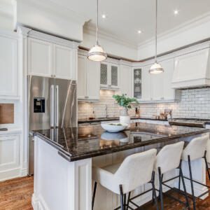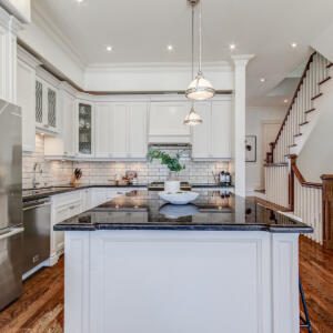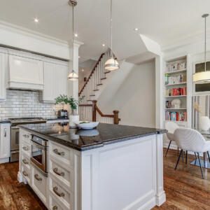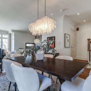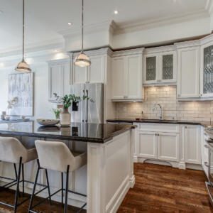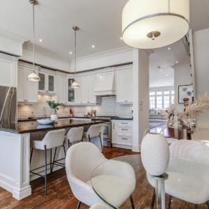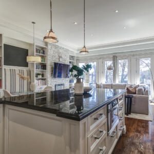 Step inside to soaring ceilings, rich hardwood floors, and exquisite millwork and mouldings that imbue the space with character. The formal living and dining rooms offer refined charm, while the heart of the home lies in the oversized family room – an inviting space anchored by custom cabinetry and a striking stone fireplace. This seamlessly flows into the oversized kitchen with a massive island, breakfast area with banquette, and a wall of south-facing windows that overlook a sizeable deck and deep backyard. It’s the perfect layout for everyday living and effortless entertaining.