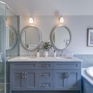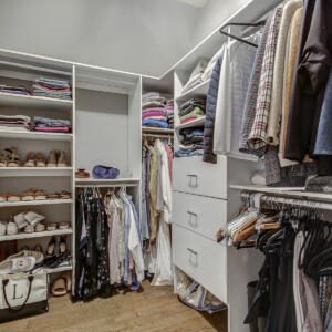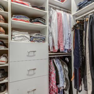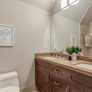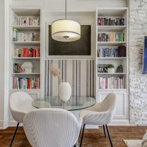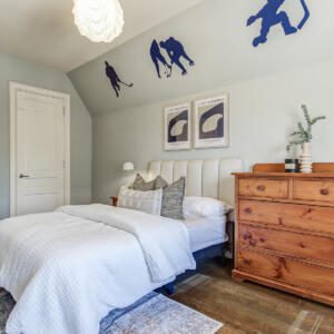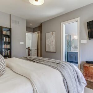 Upstairs, the bedrooms are generously proportioned with skylights and large windows enhancing the bright, airy feel. Each room is appointed with custom closets, combining thoughtful design with function. The primary suite is a true retreat, featuring a cozy sitting area, two walk-in closets, and a spa-like ensuite.