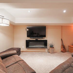 Inside, the main floor is designed for comfort and connection, with an open-concept layout that includes a great room with a floor-to-ceiling stone wood-burning fireplace, a kitchen, and a main-floor primary bedroom that faces the water. Walk out to the expansive deck for seamless indoor-outdoor living. Upstairs, two more bedrooms and a full bath offer space for family or guests. The fully finished basement adds two additional bedrooms, a full bathroom, and a generous rec room perfect for movie nights, games, or cozy winter gatherings.
