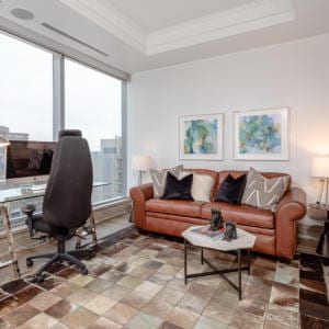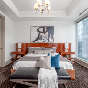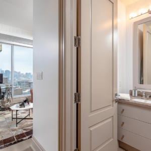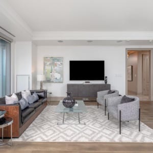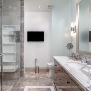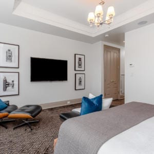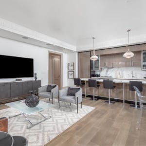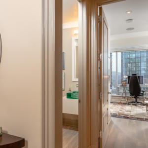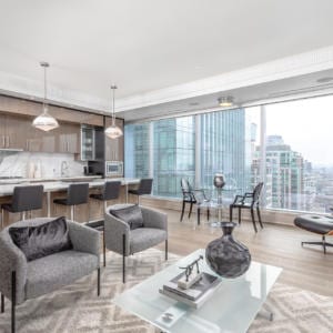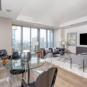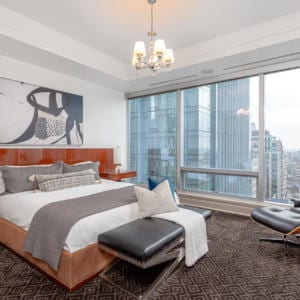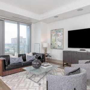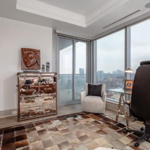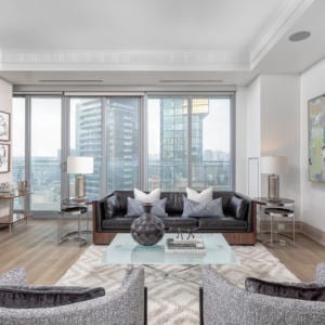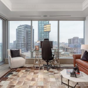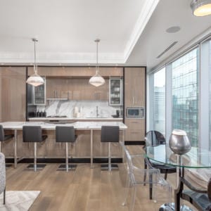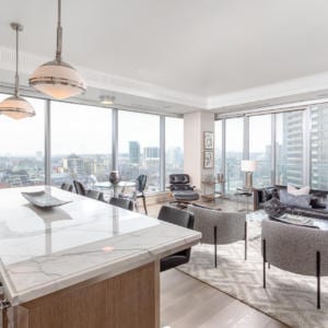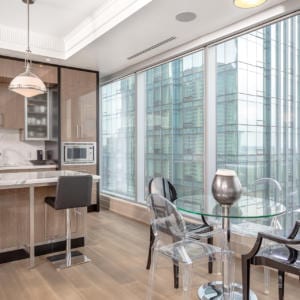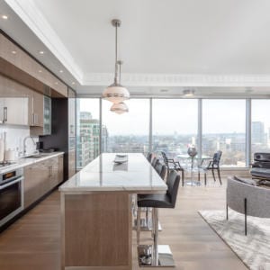 55 Scollard Street, Unit 1601 – Sophisticated living in prime Yorkville at the landmark Four Seasons Private East Residences. Breathtaking panoramic views through the floor-to-ceiling windows. The open concept great room is perfect for modern living and entertaining, and has a walk-out to the twenty foot long balcony. The gorgeous designer kitchen has high-end built-in appliances by Sub-Zero, Wolf and Miele, plus marble counters and a huge island with breakfast bar.