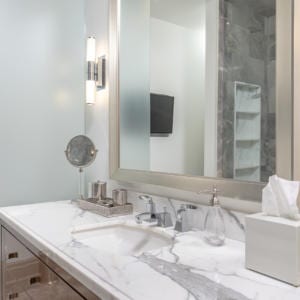 The fabulous split bedroom floor plan features a spacious master suite with a large walk-in closet and spa-inspired ensuite bathroom with marble counters and shower. The second bedroom has a four-piece ensuite bathroom, two closets and a second walk-out to the balcony.