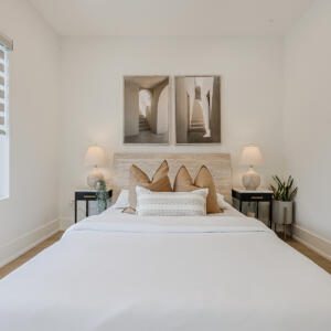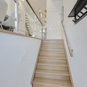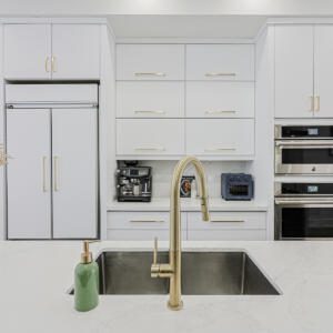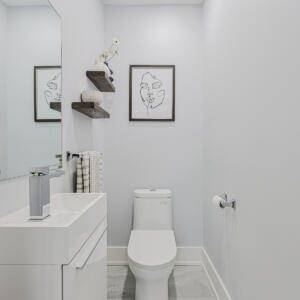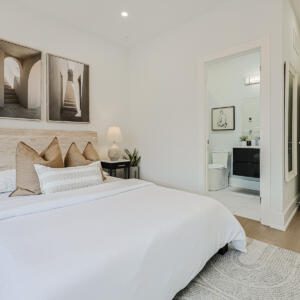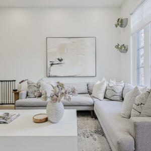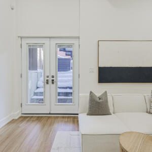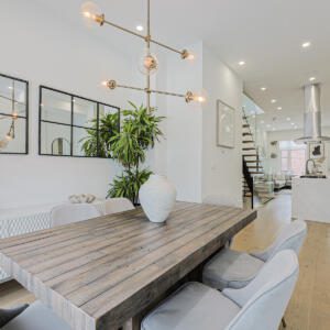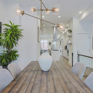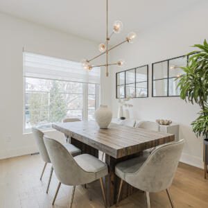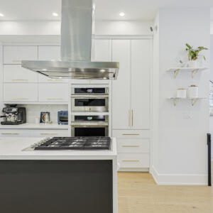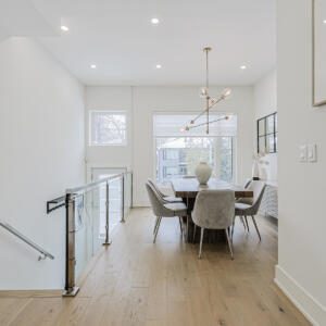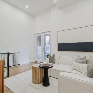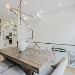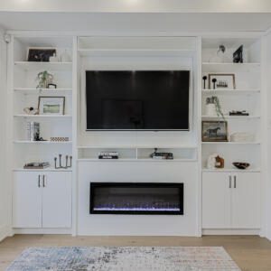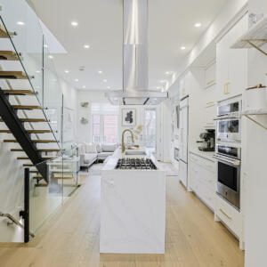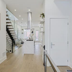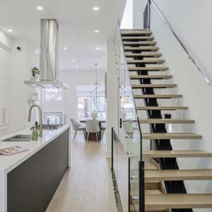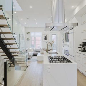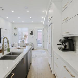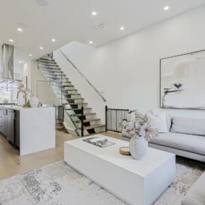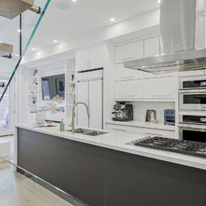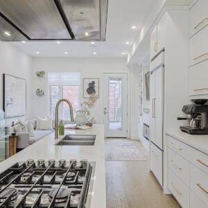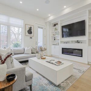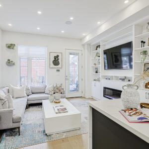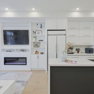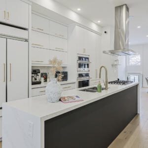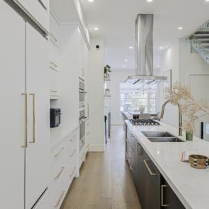 The custom-built kitchen is a standout feature with an oversized island offering exceptional storage and functionality. Stainless steel and built-in appliances including a 6 burner gas stove, magnificent quartz countertops, elegant gold fixtures, and carefully designed interior cabinet shelving. Combined with the kitchen, the living room is anchored by a built-in wall unit with electric fireplace and opens to the outdoor patio through a walk-out. Finishing the main floor is a spacious dining area.