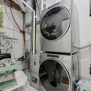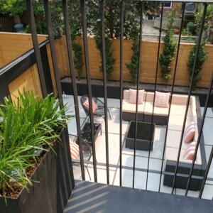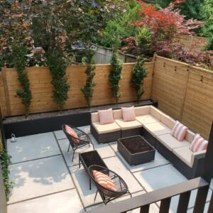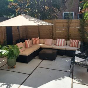 Recent exterior upgrades include a completely redesigned backyard, replacing the former wooden deck and grass yard with metal patio and stairs, concrete surfaces, and newly planted trees and landscaping. The front steps have been rebuilt and now include discreet built-in storage underneath for bins and outdoor items.