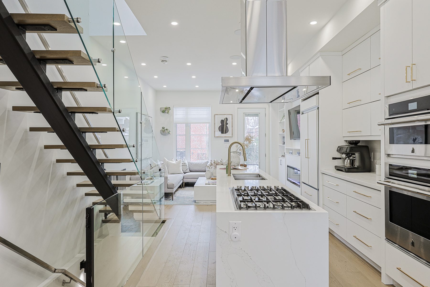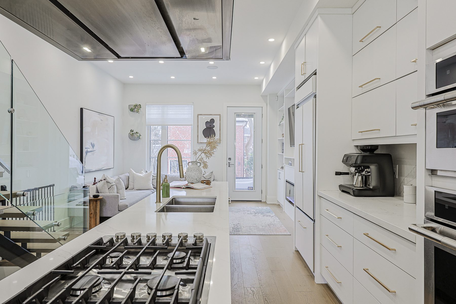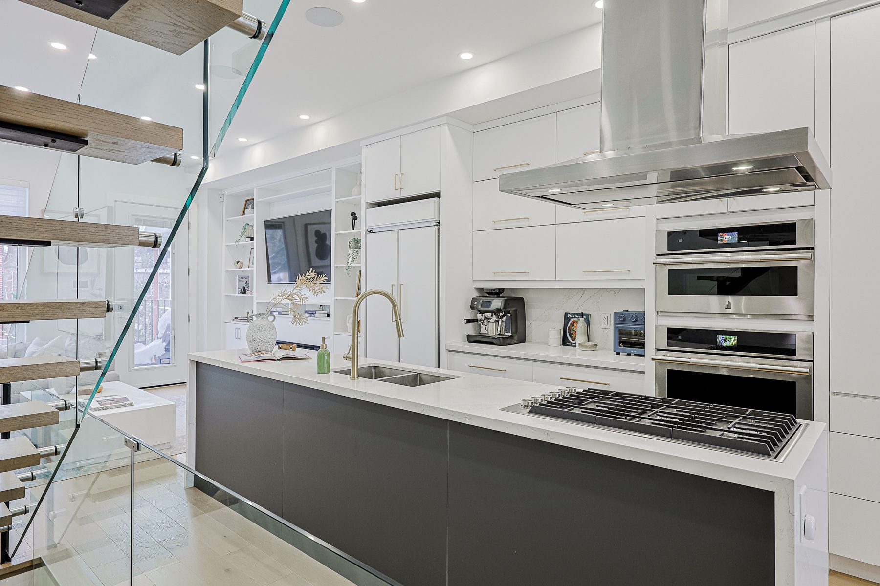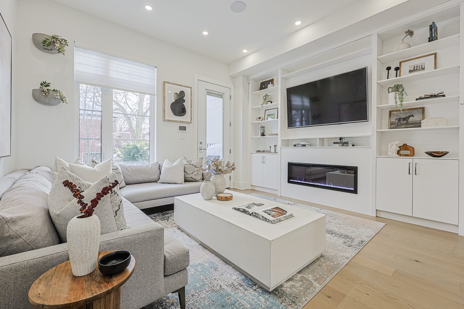 The custom-built kitchen is a standout feature with an oversized island offering exceptional storage and functionality. Stainless steel and built-in appliances including a 6 burner gas stove, magnificent quartz countertops, elegant gold fixtures, and carefully designed interior cabinet shelving. Combined with the kitchen, the living room is anchored by a built-in wall unit with electric fireplace and opens to the outdoor patio through a walk-out. Finishing the main floor is a spacious dining area.