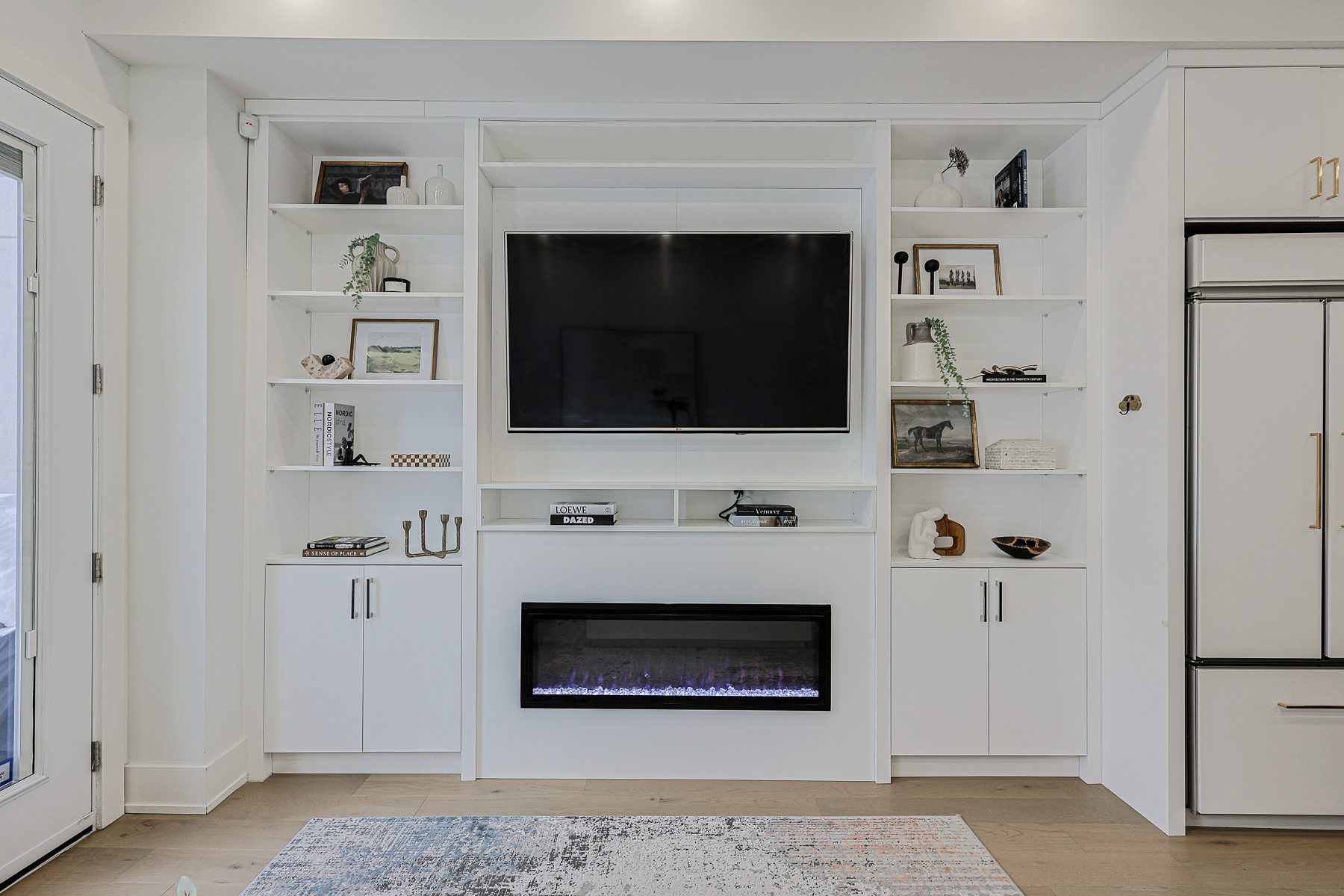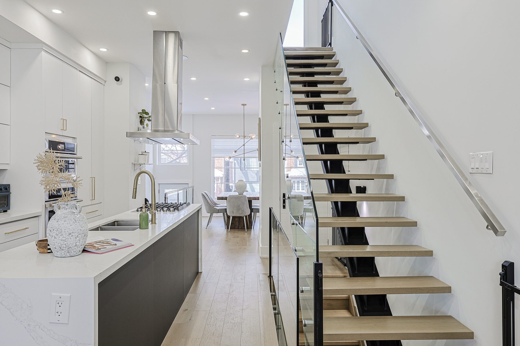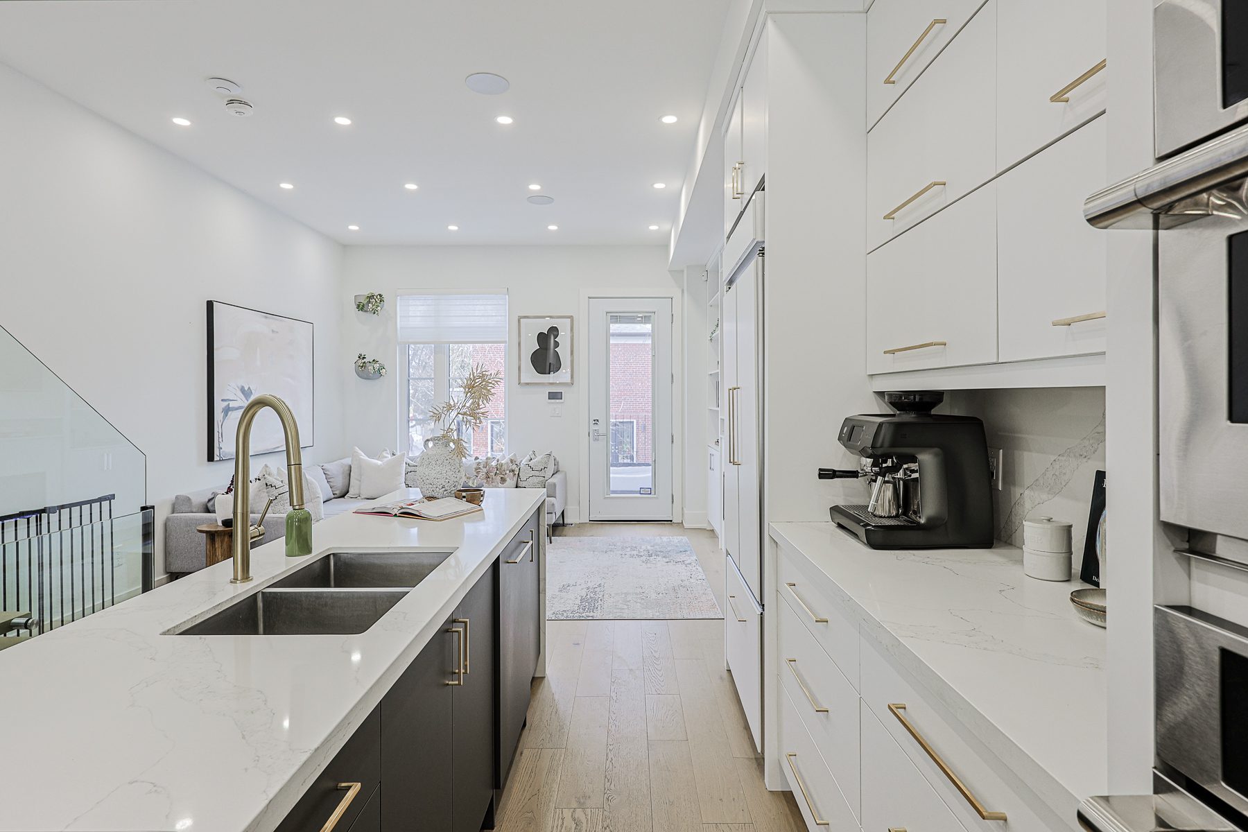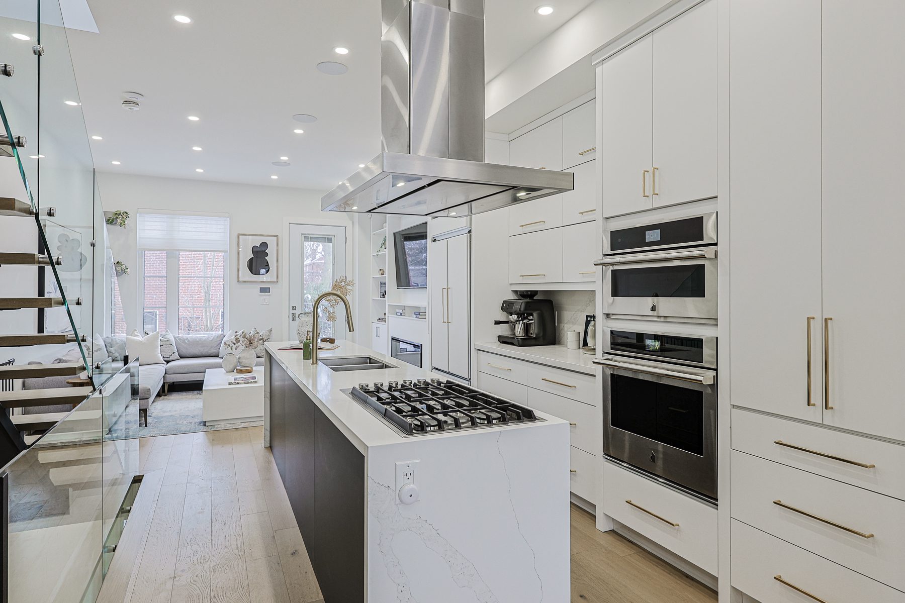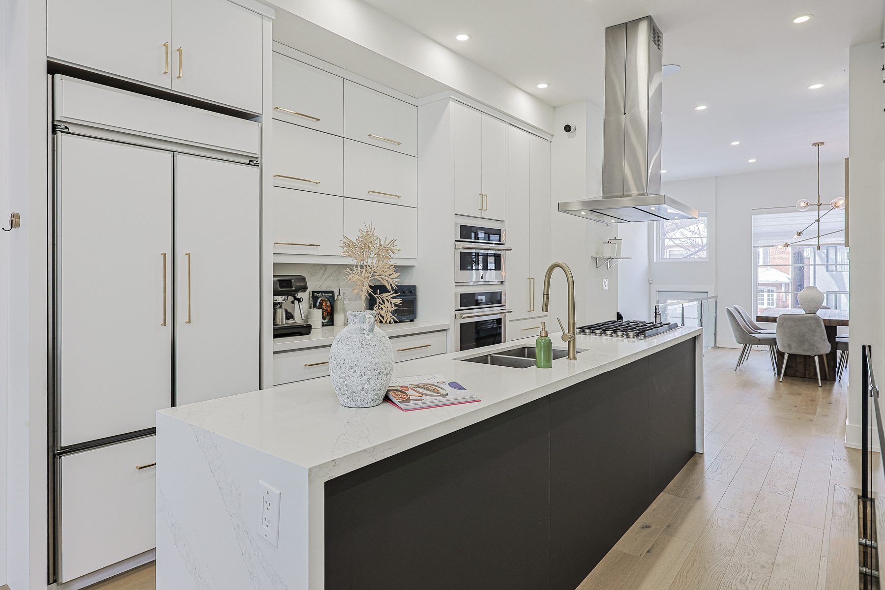 The custom-built kitchen is a standout feature with an oversized island offering exceptional storage and functionality. Stainless steel and built-in appliances including a 6 burner gas stove, magnificent quartz countertops, elegant gold fixtures, and carefully designed interior cabinet shelving. Combined with the kitchen, the living room is anchored by a built-in wall unit with electric fireplace and opens to the outdoor patio through a walk-out. Finishing the main floor is a spacious dining area.
