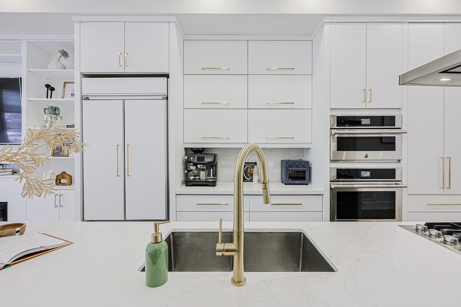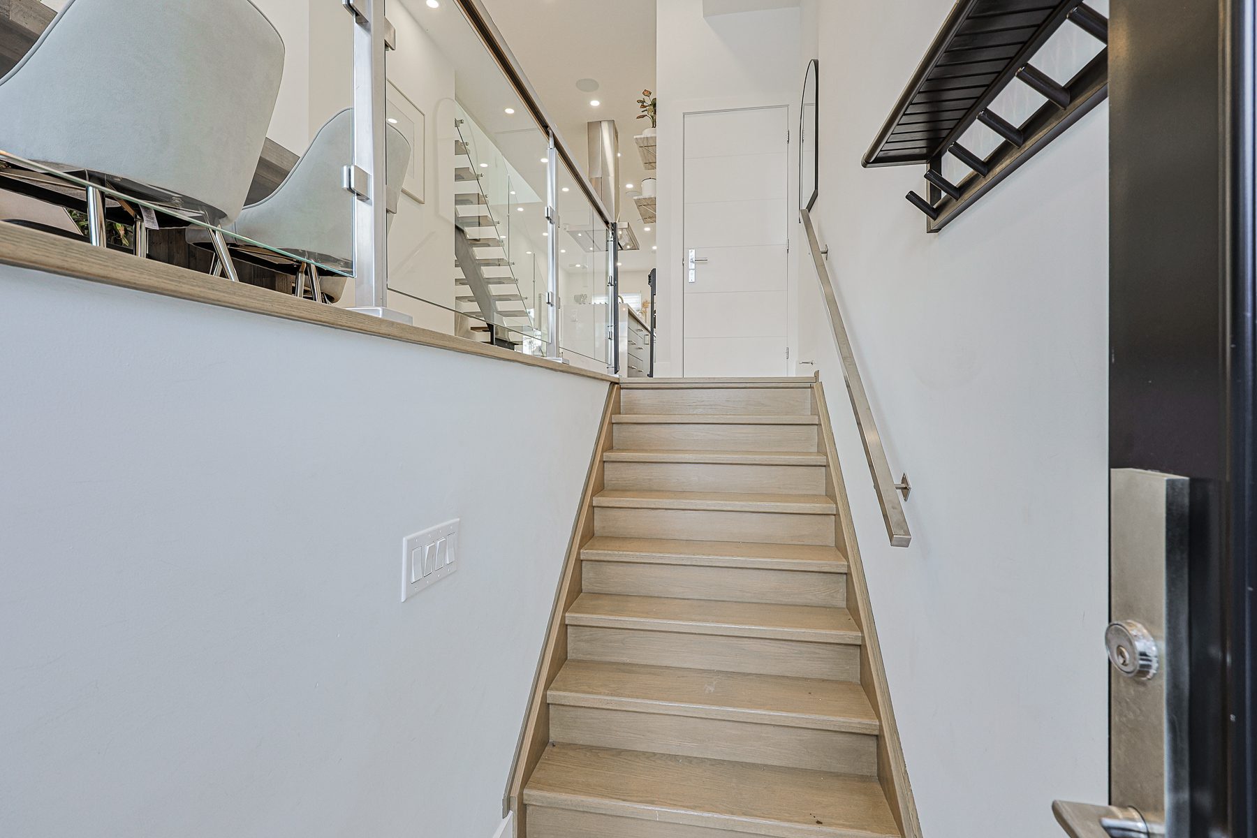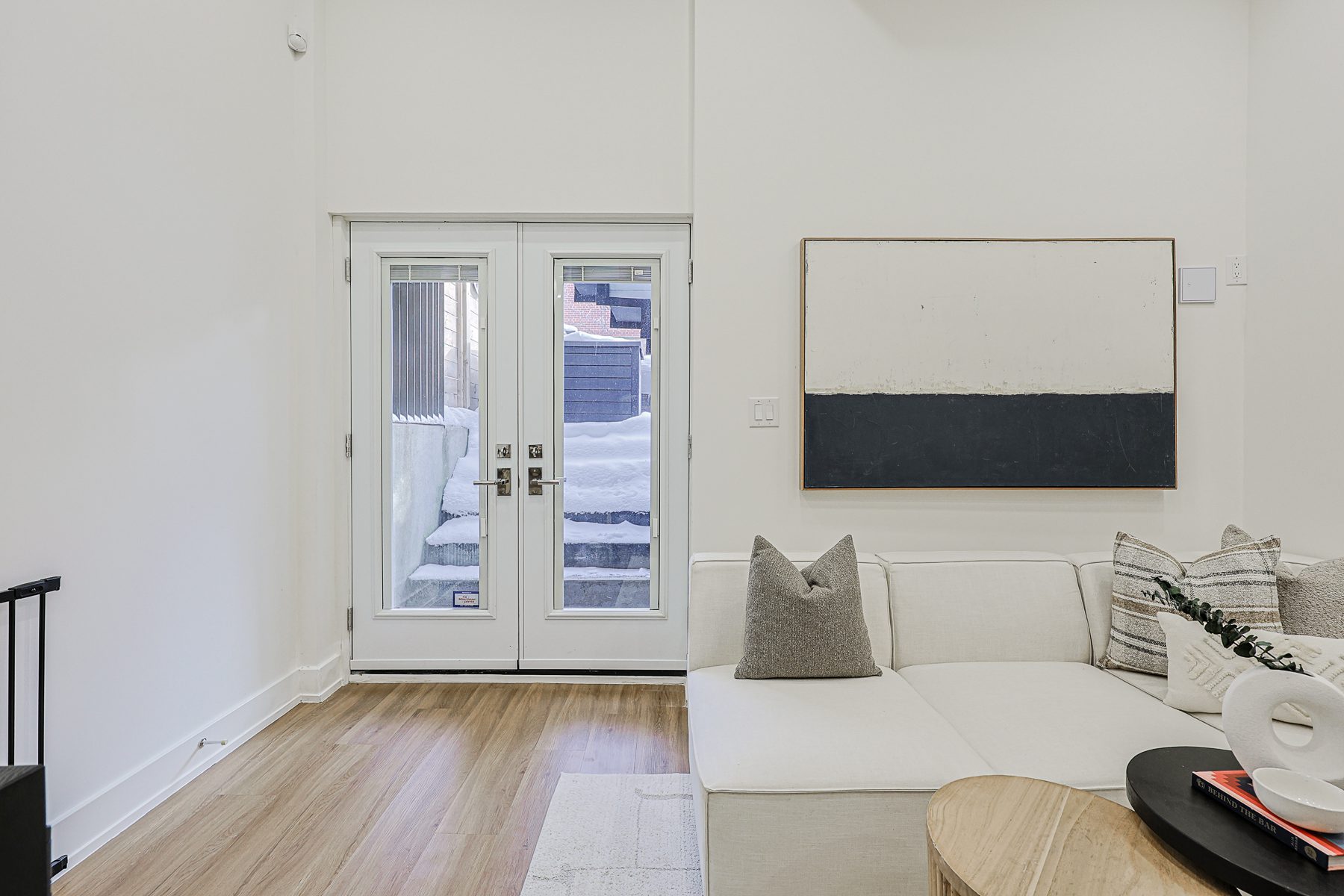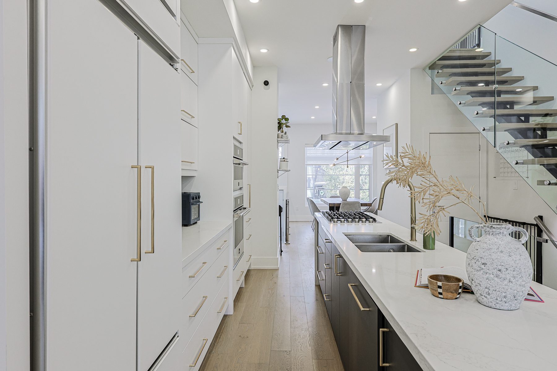 The custom-built kitchen is a standout feature with an oversized island offering exceptional storage and functionality. Stainless steel and built-in appliances including a 6 burner gas stove, magnificent quartz countertops, elegant gold fixtures, and carefully designed interior cabinet shelving. Combined with the kitchen, the living room is anchored by a built-in wall unit with electric fireplace and opens to the outdoor patio through a walk-out. Finishing the main floor is a spacious dining area.