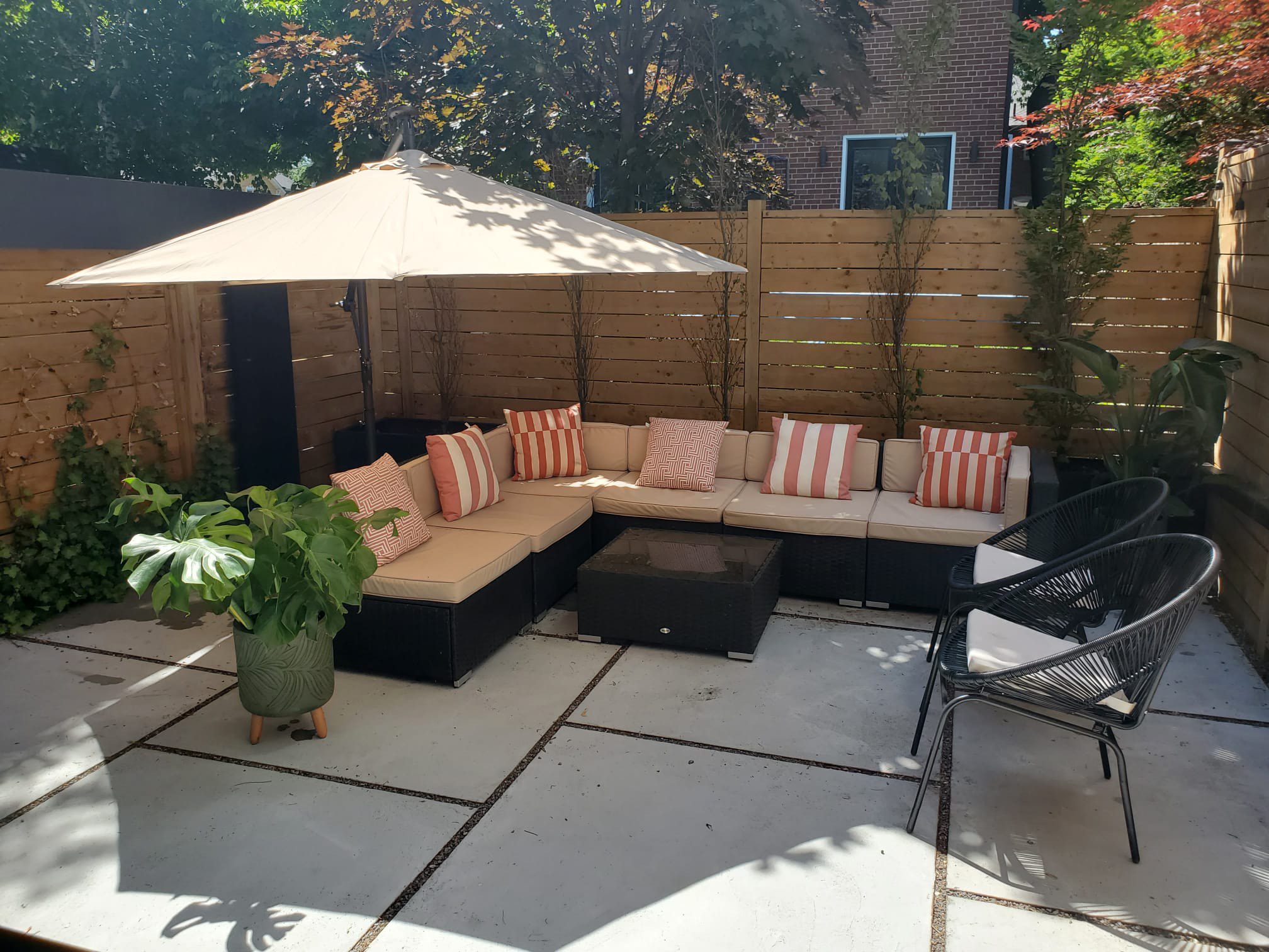 Recent exterior upgrades include a completely redesigned backyard, replacing the former wooden deck and grass yard with metal patio and stairs, concrete surfaces, and newly planted trees and landscaping. The front steps have been rebuilt and now include discreet built-in storage underneath for bins and outdoor items.
