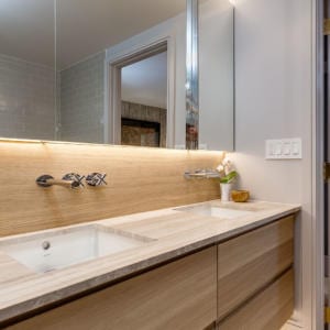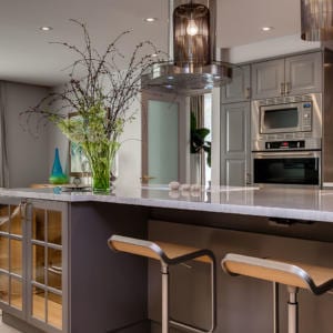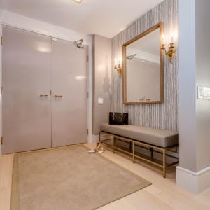 Beautifully transformed into a contemporary masterpiece by Estee Design, this completely renovated condo with 3 bedrooms and 2 baths features crisp, clean lines, a beautiful colour palette and a reconfigured floor plan that optimizes every inch of space. The open concept layout is perfect for entertaining, and centres around the designer chef’s kitchen with plenty of prep room and storage, peninsula with Carrera marble counter, built-in cooktop stove, stainless steel wall oven and microwave, and even a hideaway outlet with USB chargers.