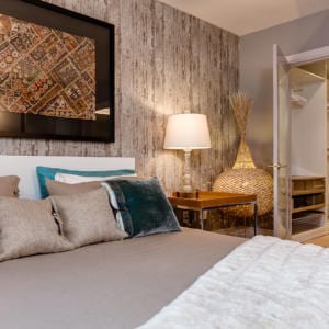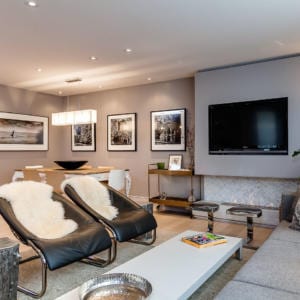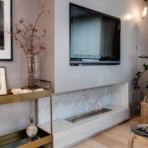 The living room boasts a clean-burning ethanol fireplace with stylish marble surround and herringbone inlay. The oversized master bedroom includes a custom walk-in closet and spa-inspired ensuite bathroom.