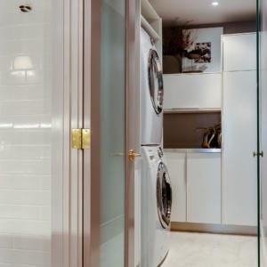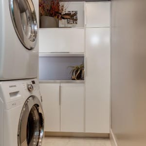 Additional improvements include new potlights, new millwork, new solid core interior doors with laminated white glass windows, new engineered white oak hardwood floors throughout and new marble tile in the bathrooms. All painting was done with low-VOC paint from Benjamin Moore. The laundry is in its own separate room with sink, counter and storage cabinets.