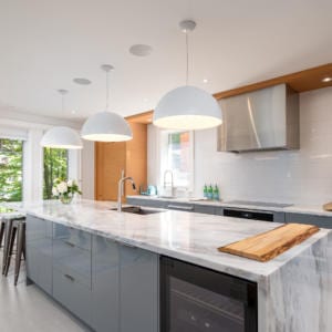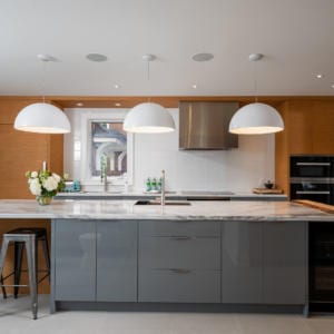 The main floor of the home boasts a show-stopper Bellini kitchen, which includes custom cabinetry, professional grade built-in appliances, stone counters, over-sized waterfall centre island, pot lights, wine fridge, built-in speakers and plenty of storage. The kitchen overlooks a huge dining room with a gorgeous chandelier, lead pain windows, pocket doors and a two-storey atrium of floor-to-ceiling windows. The well-appointed living room has a wood burning fireplace and corner wall niches. Rounding out the main floor are a powder room and a mudroom with built-in cabinets and a door that leads to the built-in garage alcove.