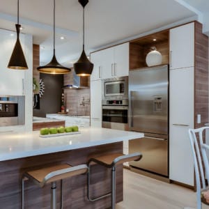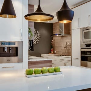 On the first floor of the unit, the dream kitchen was created by removing walls and reconfiguring the layout to allow for a more open design. The kitchen features custom cabinets with soft-closing hardware and plenty of storage, Nuvolato Grigio marble counters, Blanco double bowl under-mount granite composite sink with Blanco Posh faucet, plus a superb combination of contemporary wood-paneled walls and backsplash of whimsical hand-painted Italian tile. The new island that opens to the dining area is topped with Caesarstone and boasts Beat Lighting by Tom Dixon overhead.