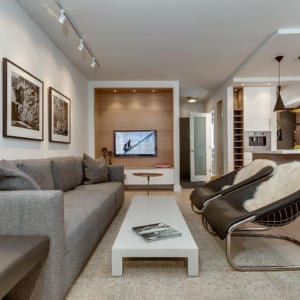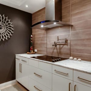 The finishing touches in the kitchen include a wall-mounted pot-filler faucet above the cooktop, a swiveling wall-mounted TV, and wall-mounted herb garden for fresh seasoning. The high-end appliances consist of a Fisher & Paykel counter-depth fridge with bottom freezer, ice-maker and water dispenser; Fulgor ceramic cooktop with European-style stainless steel hood vent; Fulgor 30” convection wall oven; Panasonic microwave with trim kit; Bloomberg dishwasher; and Scholtes built-in coffee system with water supply.