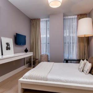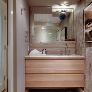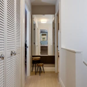 On the second floor of the unit, the master bedroom layout has been reconfigured to enlarge the custom walk-in closet that now includes a make-up desk. The second terrace is accessed via the master bedroom. The spa-inspired ensuite bathroom consists of a six-foot acrylic soaker tub, oak cabinets and panels, marble counters, large medicine cabinet, ambient lighting options, and heated floors.
