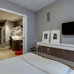 The original second bedroom has been divided into two separate rooms, divided by sliding pocket doors to better optimize the space that now makes room for a good-sized bedroom in tandem with an equally good-sized home office or den. The office has two big built-in closets and a built-in office desk with shelves. The laundry area has a new Whirlpool Energy Star front-loading, stacked washer and dryer, and is finished with white ceramic tiles, a smart shelving unit, counter for folding and baskets for storage.