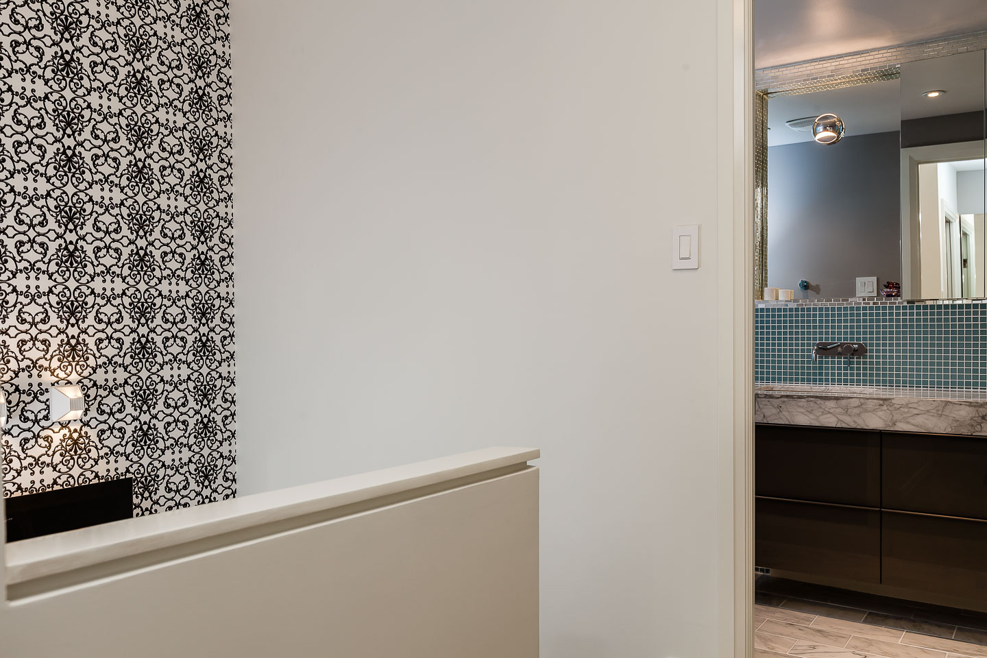 On the first floor of the unit, the dream kitchen was created by removing walls and reconfiguring the layout to allow for a more open design. The kitchen features custom cabinets with soft-closing hardware and plenty of storage, Nuvolato Grigio marble counters, Blanco double bowl under-mount granite composite sink with Blanco Posh faucet, plus a superb combination of contemporary wood-paneled walls and backsplash of whimsical hand-painted Italian tile. The new island that opens to the dining area is topped with Caesarstone and boasts Beat Lighting by Tom Dixon overhead.