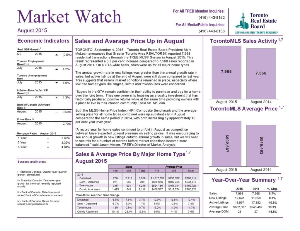 September 4, 2015 — Toronto Real Estate Board President Mark McLean announced that Greater Toronto Area REALTORS® reported 7,998 residential transactions through the TREB MLS® System in August 2015. This result represented a 5.7 per cent increase compared to 7,568 sales reported in August 2014. On a GTA-wide basis, sales were up for all major home types.